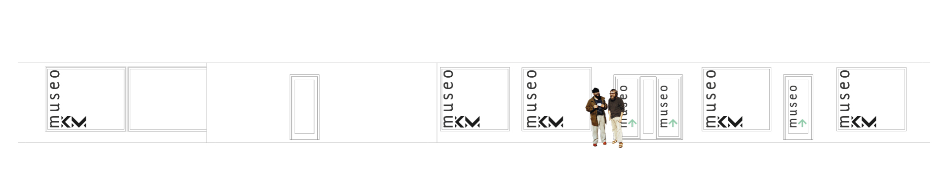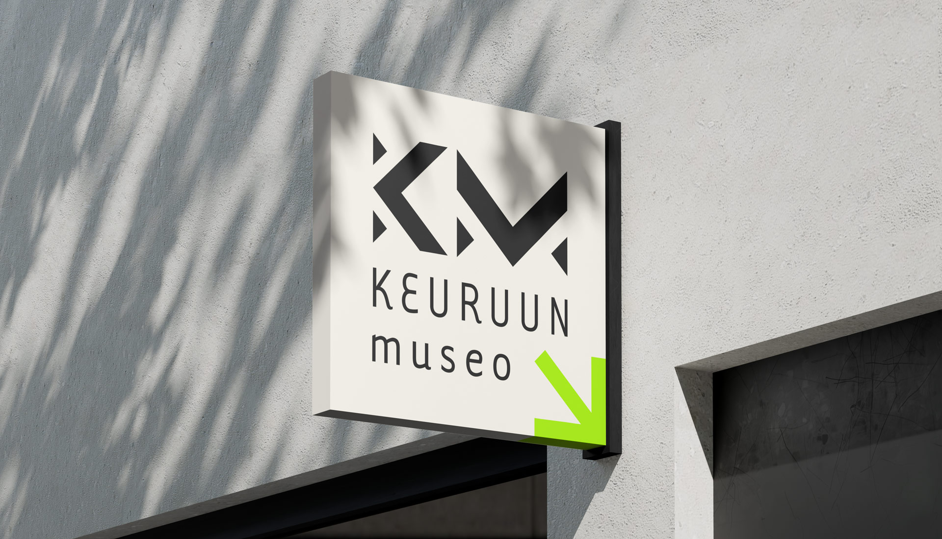 Alla ehdotus toteutukseen: julkisivun ikkunoissa suuri, mutta hiljainen, tarroitus. Selkokielellä: Museo. Logotyyppi KM viittaa Keuruun museoon. Ei mölyä, ei ääntä mutta näkyy Keuruun päätien varrelle. Vihreät nuolet johdattavat avonaisille oville. Pääjulkisivussa kellon alla iso kyltti jossa Keuruun museon koko logo vaakana.