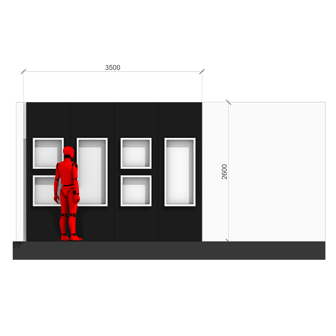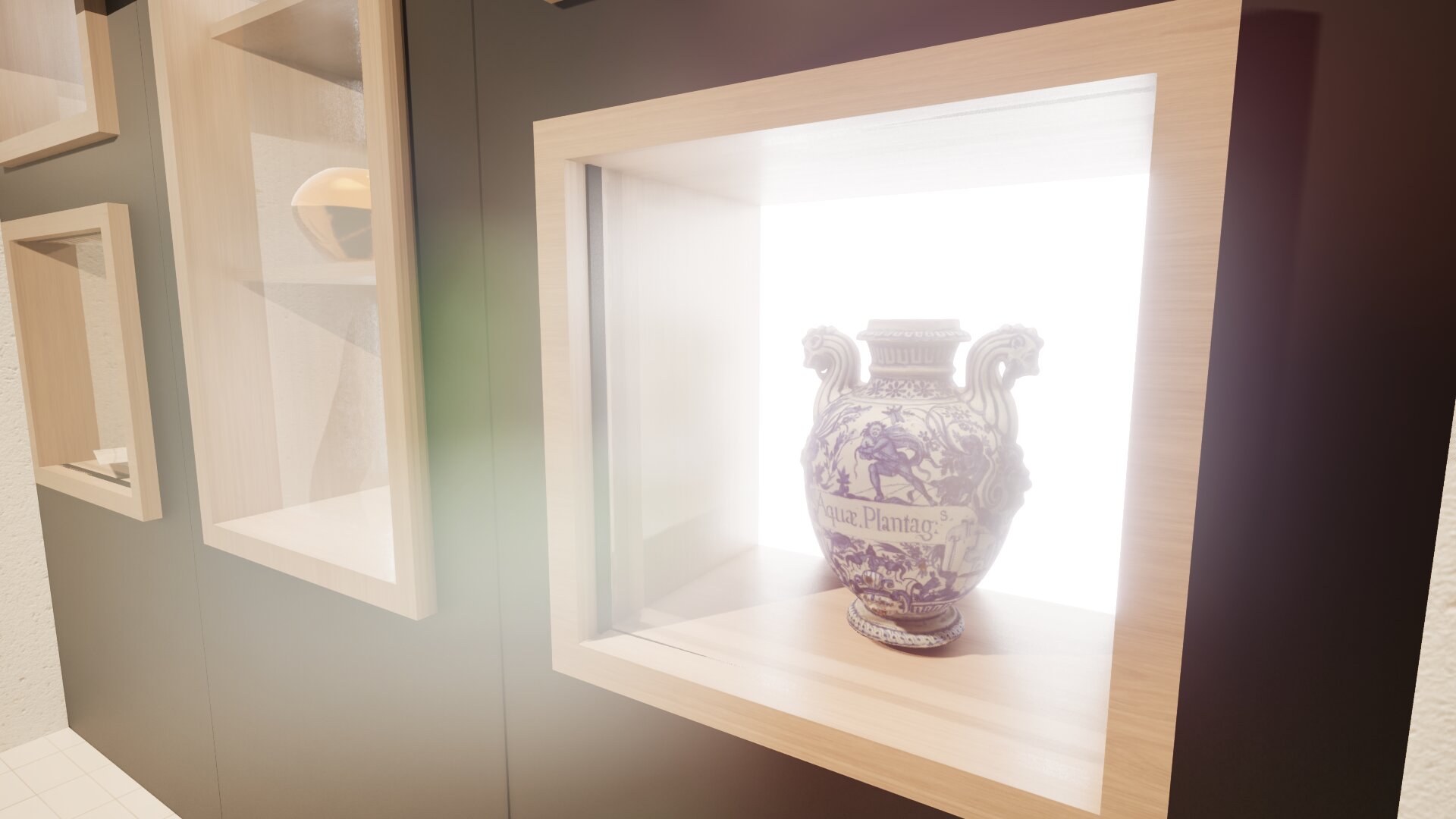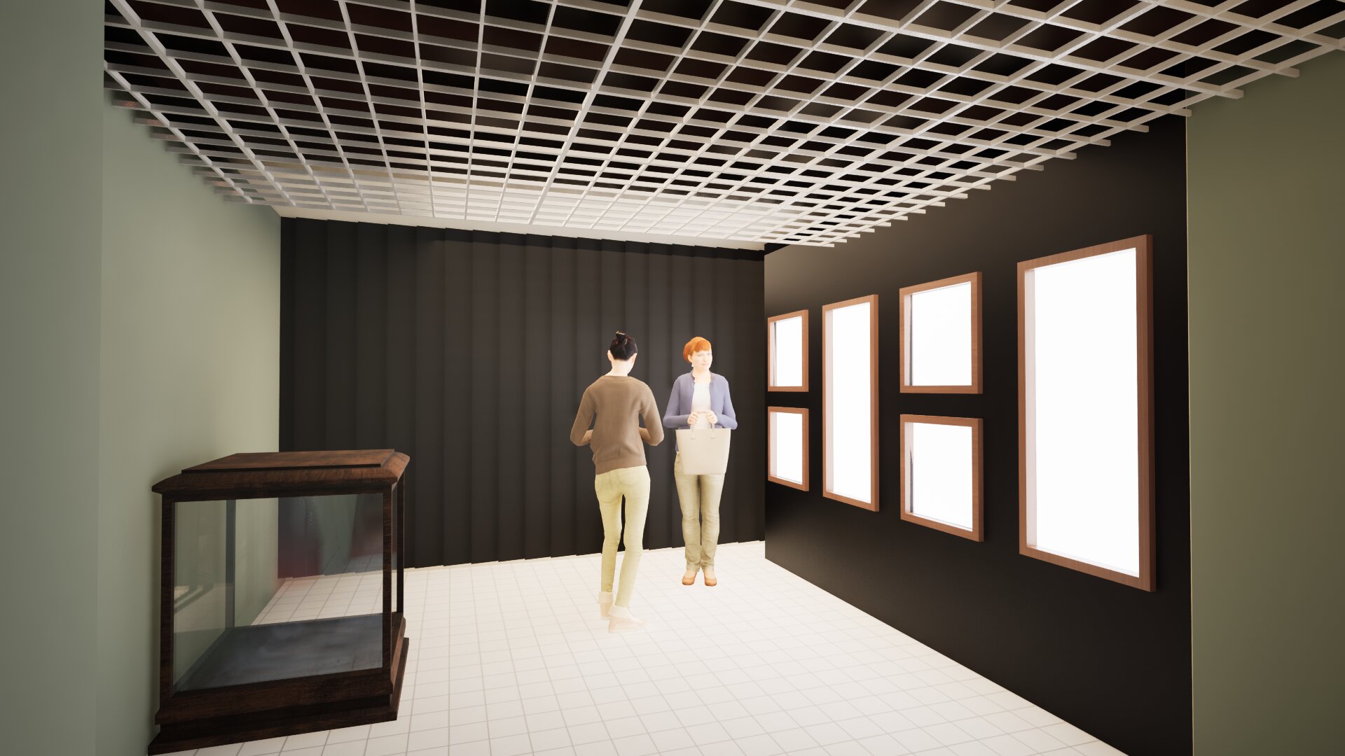 Perusnäyttelytilan seinän kulmaus mahdollistaa rakentaa siihen kiinteän vitriinillisen seinäkkeen. Tässä kuvia yhdestä mahdollisuudesta. Seinäke, joka koostuu neljästä moduulista, koolataan (rakenteita ei näissä havainnekuvissa näy) paikoilleen. Seinäkkeissä on paikat lokeroille. Lokerikkojen edessä on lasisuoja, lasisuojan voi nostaa ulkoapäin ylös jolloin obejtin voi tarvittaessa vaihtaa. Lokerikon takaseinällä on ihannetapauksessa ledvalopinta. Kuvat eivät ole vielä yksityiskohtaisia.