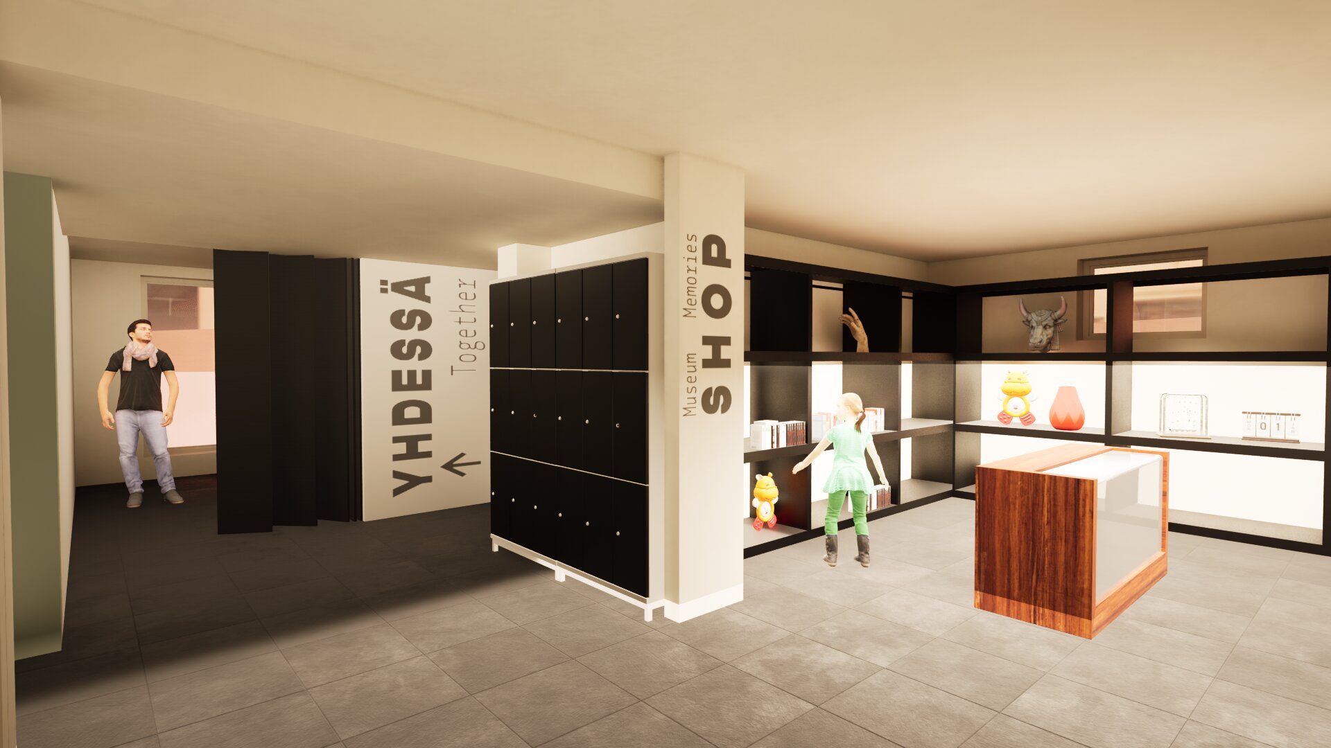Kokonaisuus on suunniteltu selkeäksi, pelkistetyksi ja helposti muunneltavaksi – taustaksi museokaupan tuotteille ja sisällöille.