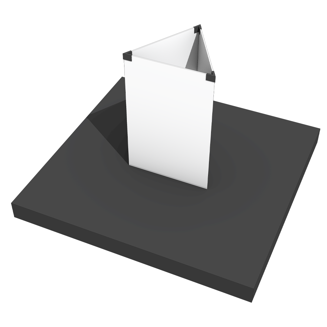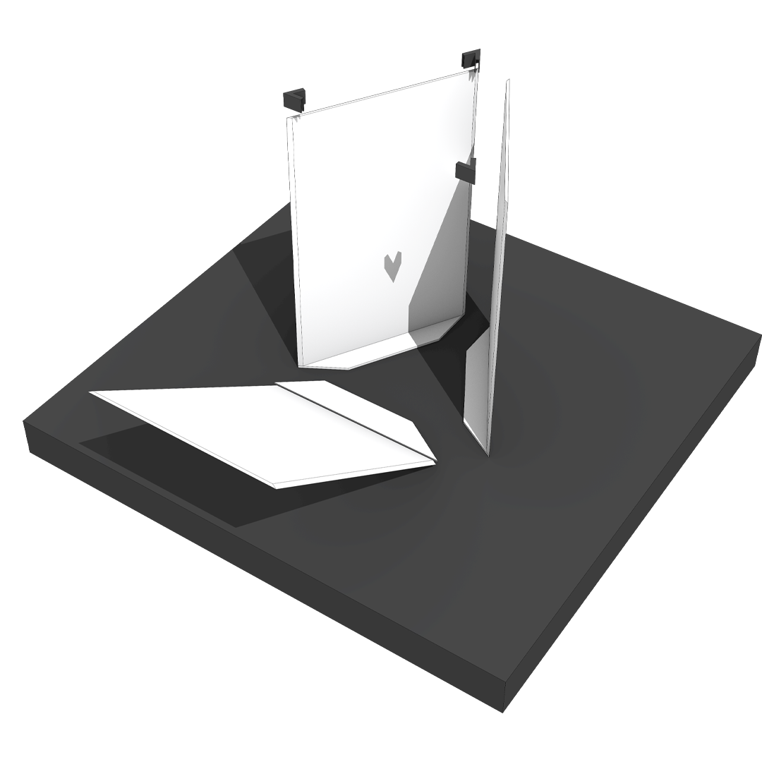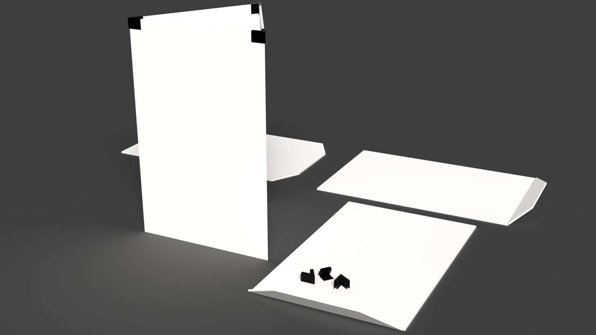 Seinäkkeet lukittuvat yläreunastaan 3D-printatuilla klipseillä, jotka määrittävät rakenteen muodon ja kulman. Yläreunaan 3D-printataan myös “kisko”, johon töitä ripustetaan (ei näy kuvissa). Alareunassa levyihin integroidut siivekkeet vakauttavat rakenteen ja mahdollistavat tarvittaessa lisäpainotuksen.