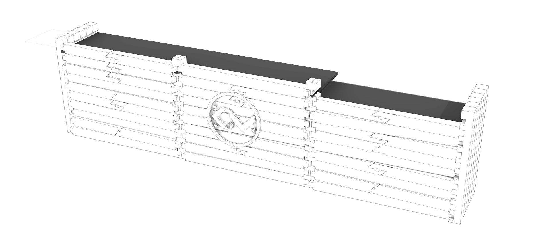 Vastaanottotiskin etupaneeli muodostuu salvotuista hirsielementeistä, jotka viittaavat suomalaiseen ja keskisuomalaiseen hirsirakentamisen perinteeseen.