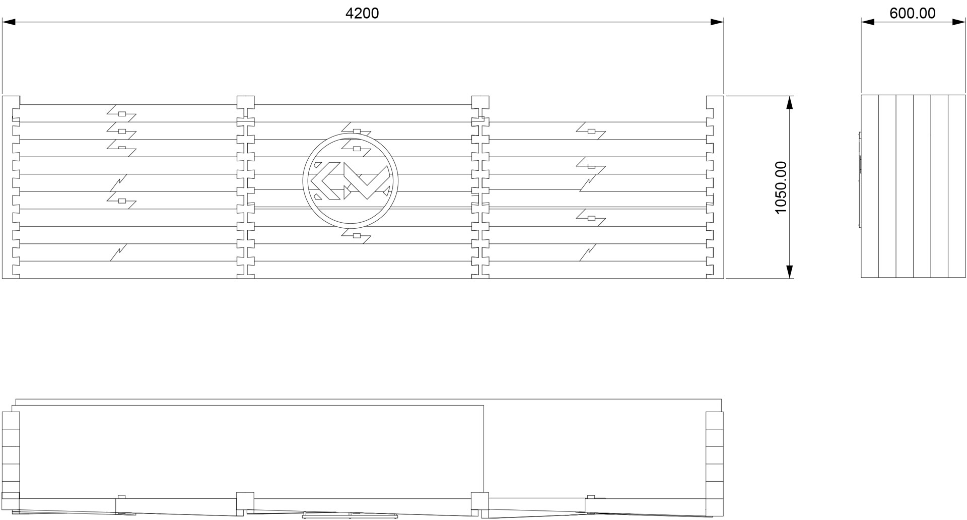 Etupaneelin keskelle kiinnitetään Keuruun museon uusi logo erillisenä elementtinä. Logo toteutetaan metallista (esim. teräs), ja se kiinnitetään tappikiinnityksellä hirsipintaan niin, että se nousee selkeästi irti puupinnasta.