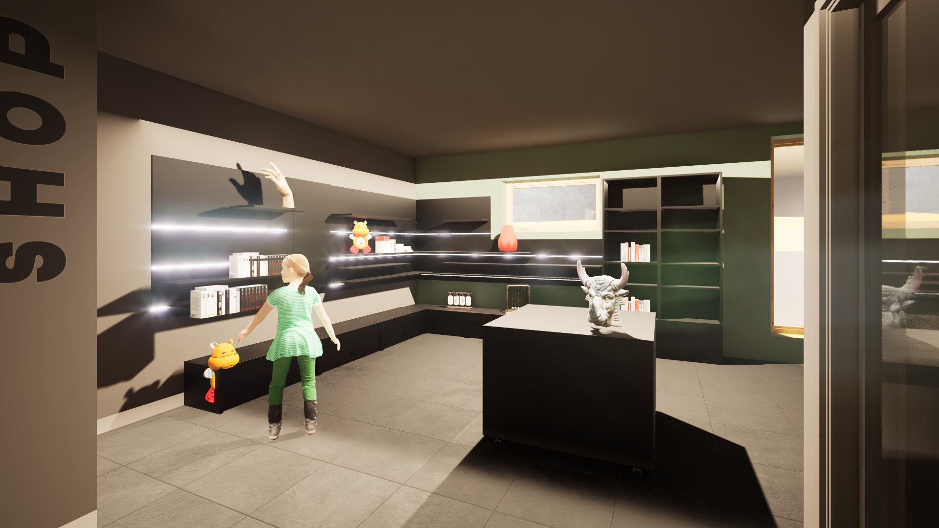 Museokaupan seinälle on suunniteltu modulaarinen ja muunneltava kiintohyllyjärjestelmä, joka mukautuu erilaisiin tuotteisiin ja näyttelytarpeisiin.