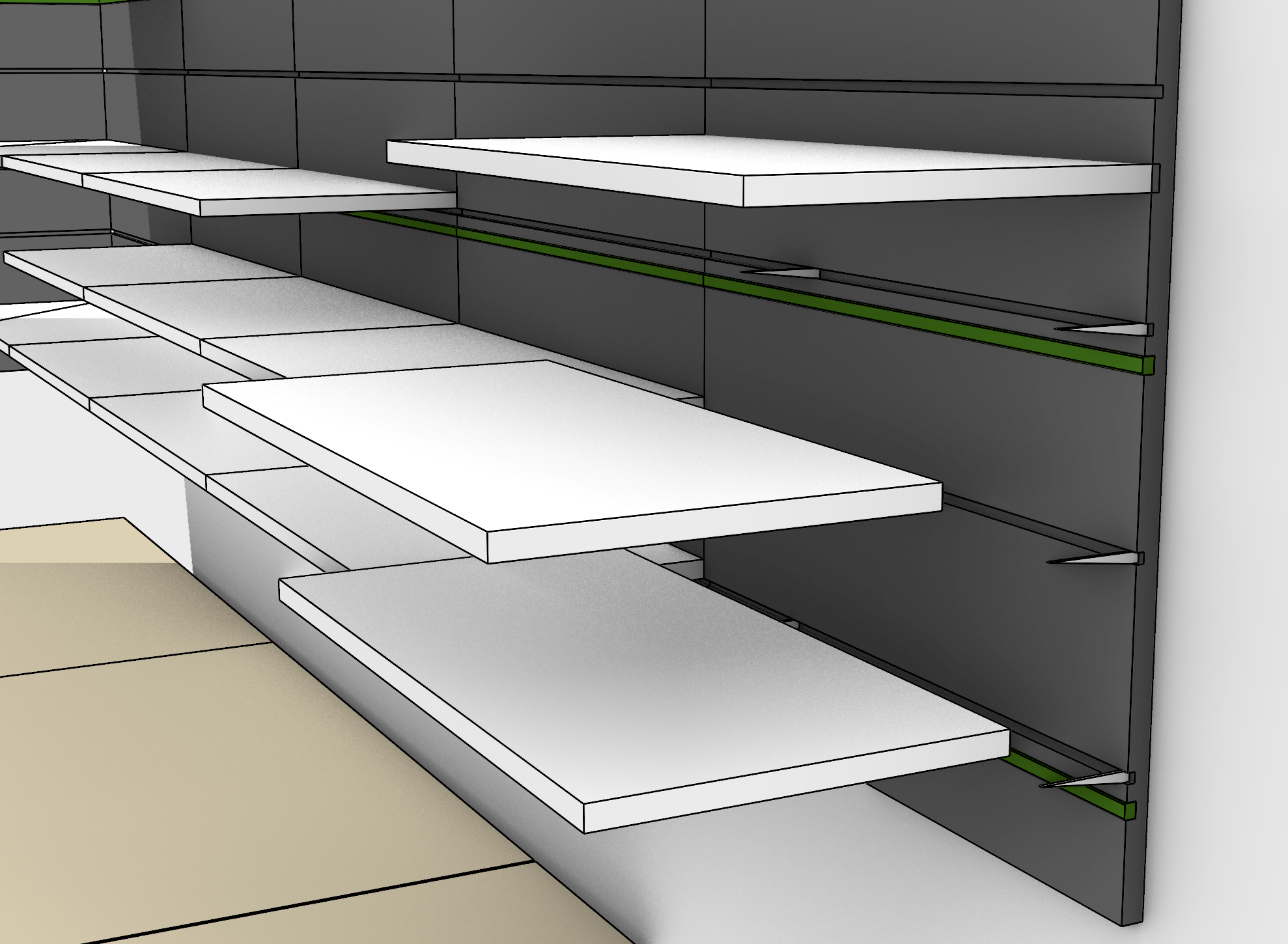 Hyllyjen taustalevy on jäykkää levymateriaalia (n. 20–25 mm), johon jyrsitään vaakasuuntaiset urat. Urat toimivat kiinnityspintana hyllyille sekä niihin asetettaville T-mallisille kannakkeille. Varsinaiset hyllylevyt (n. 25–30 mm) lepäävät kannakkeiden päällä ja kiinnitetään alapuolelta, jolloin rakenne pysyy siistinä ja helposti muunneltavana.