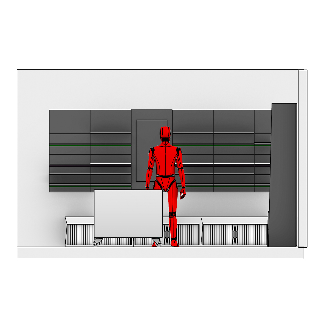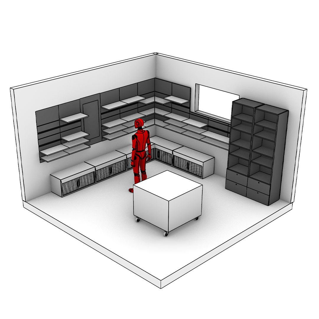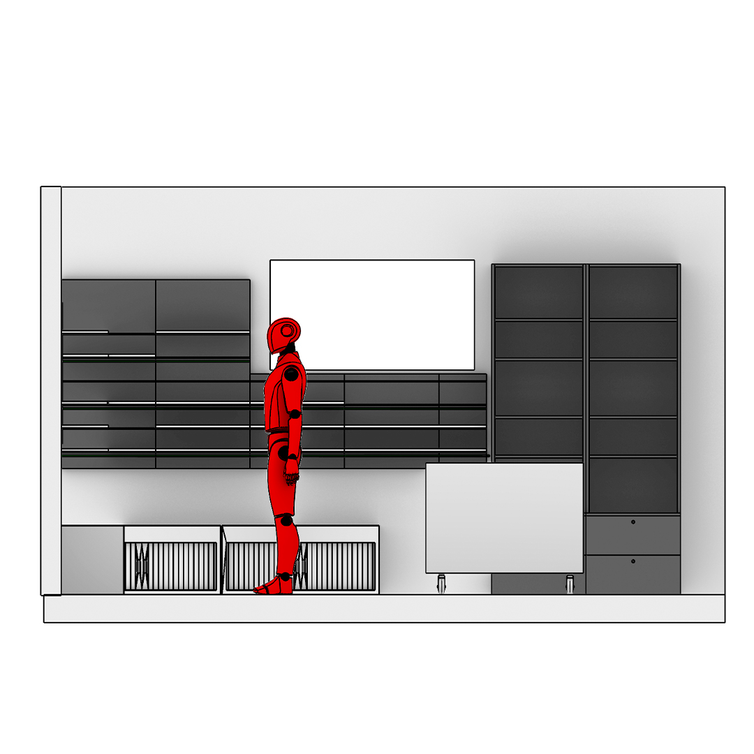 Hyllyjärjestelmän alle sijoittuvat erilliset laatikostot ja kaapistot tarjoavat museokaupalle tarvittavaa säilytystilaa ilman erillistä varastoa (huom. alahyllylaatikot tässä kuvassa ovat vain havainnetarkoituksessa).