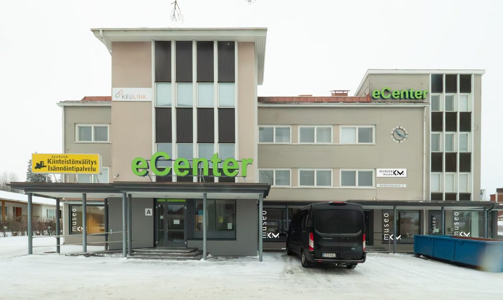 Yksinkertaisin, mutta myös tylsin, olisi asentaa kyltti kuvan mukaisesti toisen ja kolmannen kerroksen väliin. Mielenkiintoa voisi lisätä logon K- ja M -kirjaimista tehdyillä kookkailla valokylteillä katoksen reunalle… Vanha eCenter-kyltin voisi jättää kuriositeettina paikoilleen, se kertoisi myös rakennuksen, ja sitä kautta koko Keuruun keskustan, rakennetunympäristön historiaa.